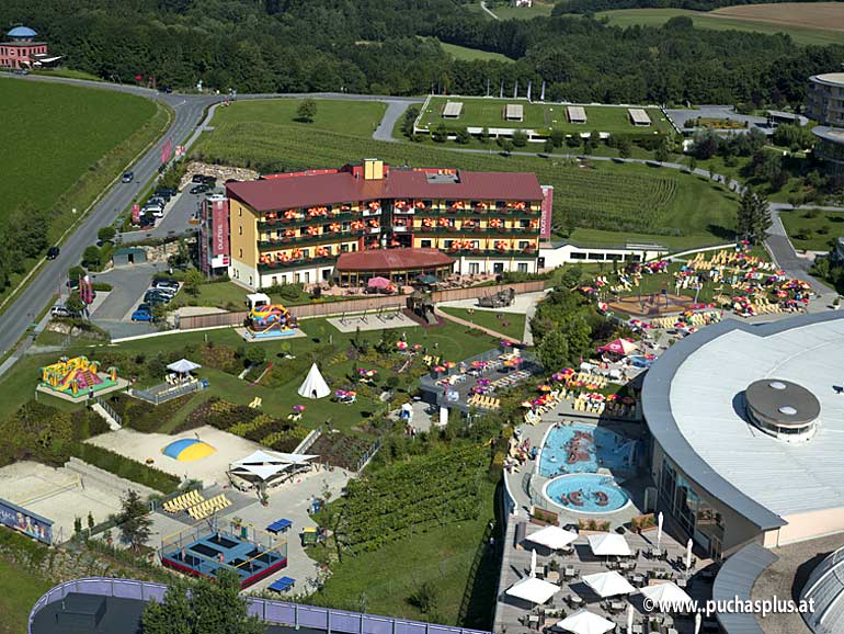 Eine kleine Bildergalerie für Sie von Aufnahmen von der Therme Stegersbach und den „Rundherum“ mit dem tollen Kinderspielplatz, einer Aufnahme des Hotels Allegria, des Hotels PuchasPlus, vom Wasserspielpark sowie von einer Wassergymnastik im Innenbereich der Therme:
